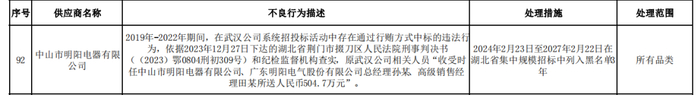 对于中山明阳、明阳电气的上述不良行为,国网湖北表示,2024年2月23日至2027年2月22日,在湖北省集中规模招标中将中山明阳、明阳电气列入黑名单3年,处理范围为所有品类。