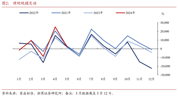 (3)或可把握存款向表外流动的主线,增加对中短票息策略的关注。在手工贴息整改的影响下,一方面理财和保险等机构前期配置存款收益下降,部分资产配置或向票息品种倾斜,另一方面居民配置存款收益也下降,居民存款可能向理财和保险等产品倾斜。对此,理财规模增长数据也做出了印证,根据普益标准数据,4月及5月(截至5月12日)理财规模分别增加约2.51万亿和1745亿,对比2023年4月及5月理财规模分别增加约1.26万亿和1531万亿,当前理财规模增长明显超往年同期水平。而根据理财偏好的资产品种看,中短期限信用债、中短期限二永债或受益,在利率策略难做超额的情况下,近期增加对中短票息策略的关注。