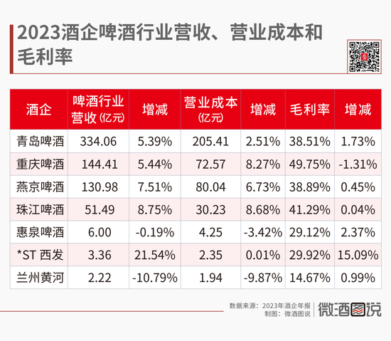 其中,按营收排序,百威亚太和华润啤酒依旧位于榜首,突破486.80亿元(68.56亿美元)和389.32亿元。2023年青岛啤酒实现营收339.37亿,稳居A股第一,和重庆啤酒、燕京啤酒、珠江啤酒共同占据共同占据A股啤酒板块95%以上营收。