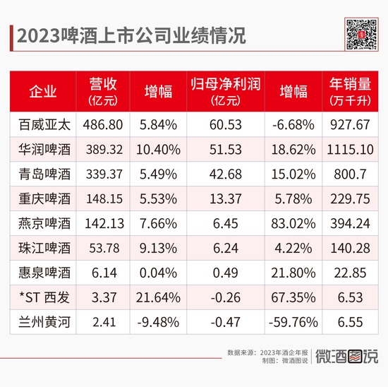 据中国酒业协会数据,2023年全国啤酒行业实现总产量3789万千升,同比增长0.8%,实现销售收入1863亿元,同比增长8.6%;实现利润总额260亿元,同比增长15.1%,利润增幅继续跑赢产量和销售收入增幅,而2023啤酒企业的财报也验证了这一数据。