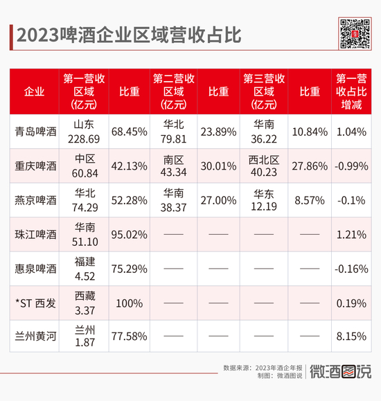 如青岛啤酒在2023年进一步强化在啤酒消费大省山东的市场占有率,较2022年增长1.04%达到68.45%的营业收入比重,而在华东、东南地区出现销售收入的负增长。燕京啤酒仍集中在华北地区,实现营收74.29亿元,占比为52.28%,和华南市场两大区域合计营收占比近80%,而华东、华中和西北地区营收占比均不足10%。珠江啤酒则进一步攻占华南地区,较2022年增长1.21%的区域营收占比,达到95.02%。
