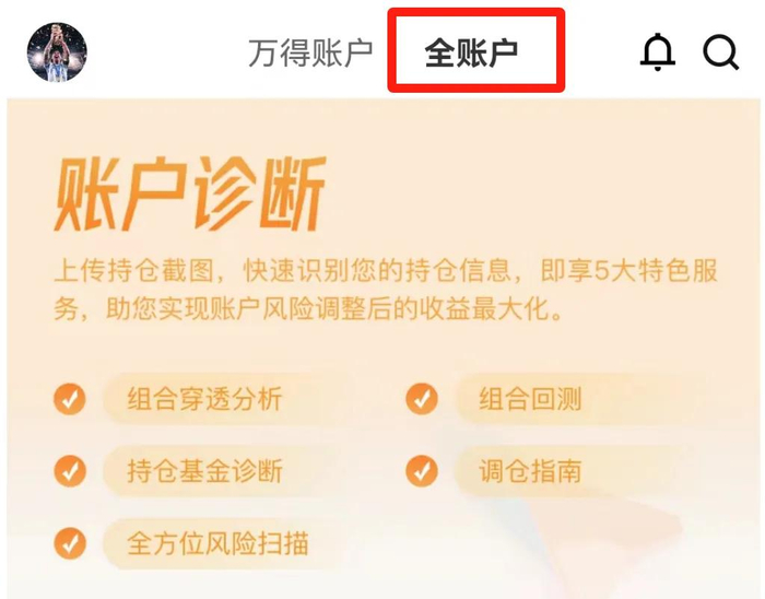 打开万得基金APP,点击首页顶部全账户,进入“全账户”主页。