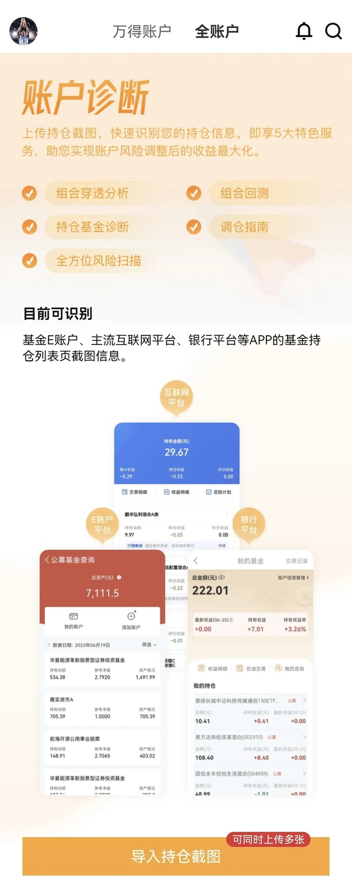现在您只需上传基金E账户等平台的基金持仓截图,即可在万得基金APP中查看到对应平台的基金持仓信息,一个界面清晰明了,持仓资产全掌握,从此告别在多个平台间频繁切换和人工计算资产的烦恼!