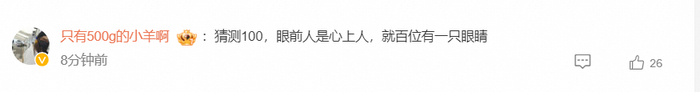而在其评论区,还有网友自信给出答案:“猜测数字是100,下一句是‘眼前人是心上人’,就百位露出了一只眼睛。”