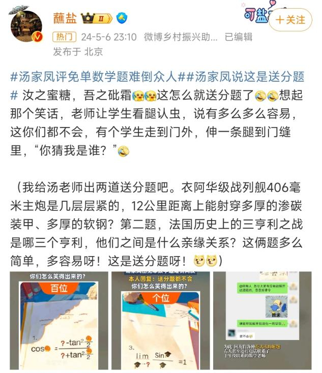 对此,微博大V蘸盐回应道:“汝之蜜糖、吾之砒霜。”并向汤老师发起历史知识挑战。不过,历史大V史小煮却表示:“这题真是初中题目,不会做咋睡得着的?”