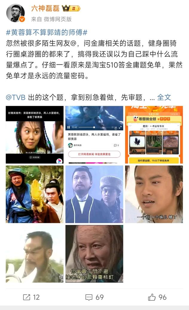 同时,在TVB版《射雕英雄传》专场,“金庸迷”六神磊磊,成了网友的第一求助对象,在微博上小火了一把。