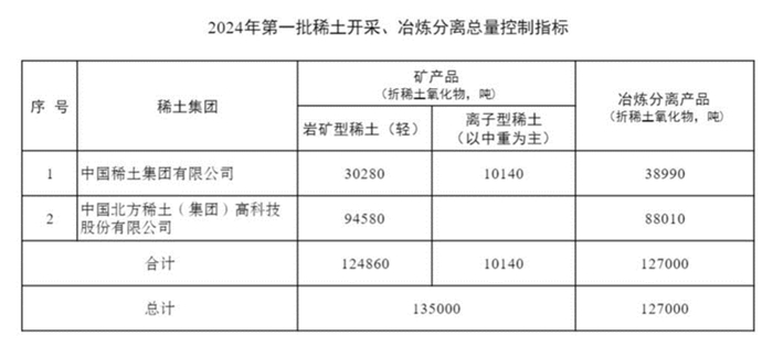 今年2月,工信部、自然资源部已早于去年同批下达了《2024年第一批稀土开采、冶炼分离总量控制指标的通知》(下称“通知”),2024年第一批稀土开采、冶炼分离总量控制指标分别为13.50万吨、12.70万吨,较2023年第一批分别增长12.50%、10.43%。不过,同比增幅收窄。