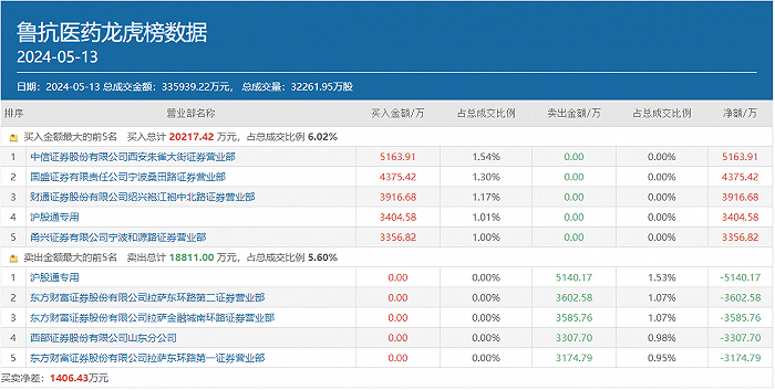 5月10日,中信证券西安朱雀大街同时出现在鲁抗医药买卖双方前五位中,买入金额为3069.22万元,卖出金额为4823.4万元。同日披露的3日龙虎榜数据,上述席位买入金额为10421.64万元,卖出金额为8099.46万元。