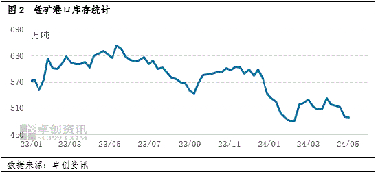 从下面图中可看出,当前港口库存数量处于近两年低位,截至5月初,天津港进口锰矿库存约360万吨(其中加蓬块约70万吨,澳矿约69.5万吨,南非高铁约63万吨)。近期国内下游硅锰以及锰铁开工有所提升,下游需求好转,而港口库存持续下行,再次对锰矿价格拉涨形成支撑。