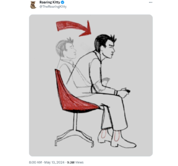 市场的异动可能源于上周末一条社交媒体的动态。网名为“Roaring Kitty”用户在阔别三年之后重回公众视野,在素描图中一名男子在椅子上坐起前倾,似乎准备再次出手。