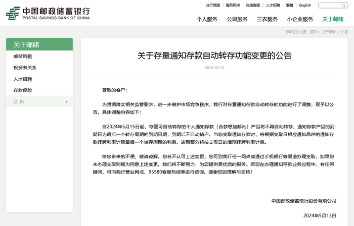 今日下午,邮储银行在官网发布了《关于存量通知存款自动转存功能变更的公告》。