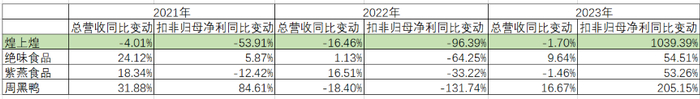 与同受国内宏观经济态势和市场环境变化影响的同行业公司相比,煌上煌业绩下滑的时间相对较早,波动最为剧烈。在煌上煌、绝味食品、紫燕食品及周黑鸭四家主营业务为卤味的可比公司中,2021年煌上煌为唯一一家营收同比下降且扣非归母净利润下降幅度超50%的公司,2022年其业绩下滑幅度在四家公司中相对较深,2023年其业绩,尤其是扣非归母净利润同比反弹幅度亦相对较大,整体业绩波动程度相对较深。