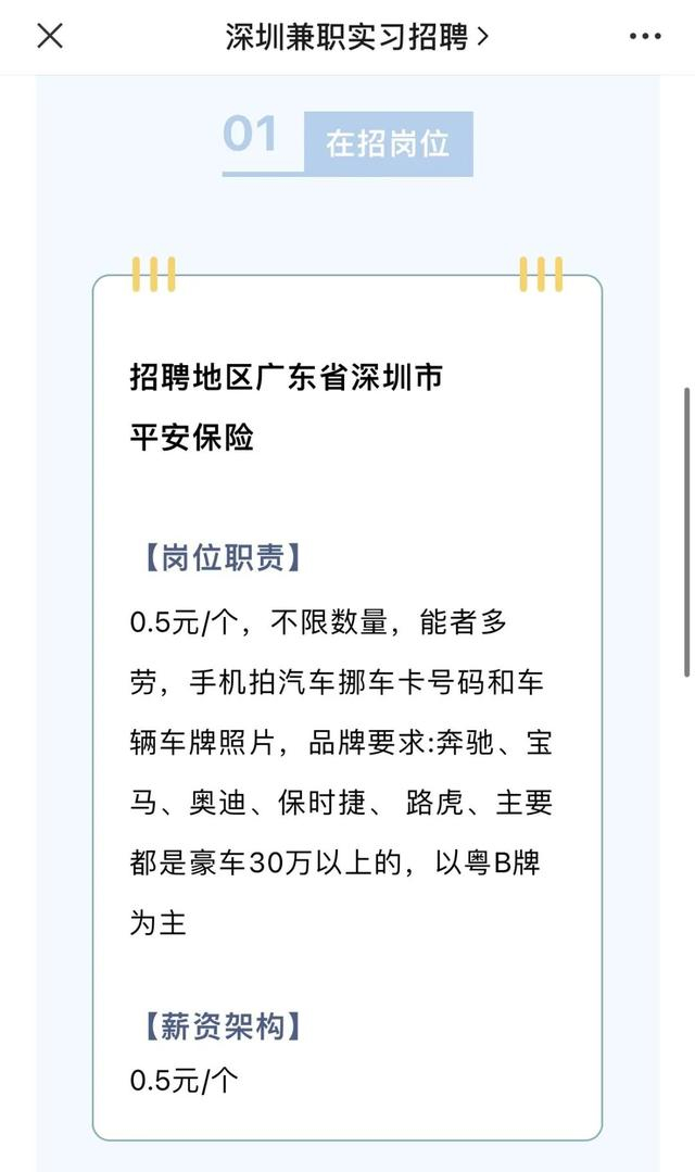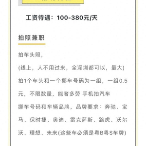 近日,深圳本地一则兼职信息引发关注,兼职内容为拍摄车头照片,要求包含车牌号、挪车手机号等信息,并对车辆品牌进行了限定,每张报酬0.5元。该内容引发广大车主对个人隐私被泄露的担忧。