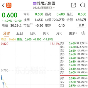 5月14日,雅居乐股价开盘大跌,截至发稿,雅居乐报0.6港元/股,下跌14.29%,总市值30.28亿港元。