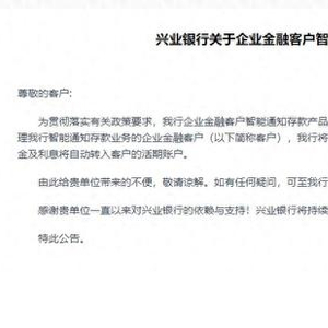 此外,5月10日,兴业银行宣布,个人智能通知存款产品将于2024年5月15日起自动终止。已办理我行个人智能通知存款业务的客户,我行将于最近一个结息日为客户办理结息并自动解约,届时产品的本金及利息将自动转入个人客户活期账户。