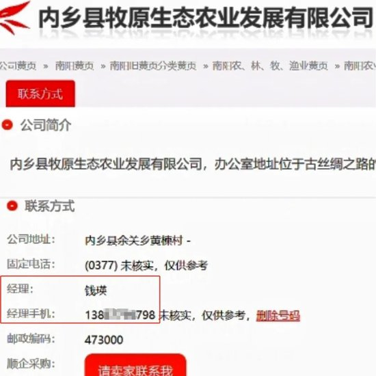 牧原股份实控人钱瑛的号码来源则比较特殊,显示为门户网站,“全网最早出现时间”为2018年9月。点击钱瑛号码的来源链接,网页分别跳转至顺企网、利酷搜黄页网、搜了网、找找去网,这些网站完整展示了钱瑛的电话号码,与探客查显示一致。上述网站将该电话号码关联在内乡县牧原生态农业发展有限公司名下,但记者发现,实际上该企业已变更名称为内乡县牧原科技有限公司。