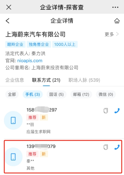 每经记者从“中国上市公司品牌价值榜”中随机挑选了部分知名上市公司,又补充了一些未上市的知名企业,在探客查上简单搜索,就发现了十位知名企业家的手机号在售,分别是:农夫山泉创始人钟睒睒、牧原股份实控人钱瑛、森马服饰创始人邱光和、荣盛集团董事长李水荣、蓝思科技董事长周群飞、新尚集团董事长唐立新、蜜雪冰城实控人张红甫、钟薛高创始人林盛、喜茶创始人聂云宸、蔚来汽车联合创始人秦力洪(为保护个人隐私,本文将展示的手机号打码)。
