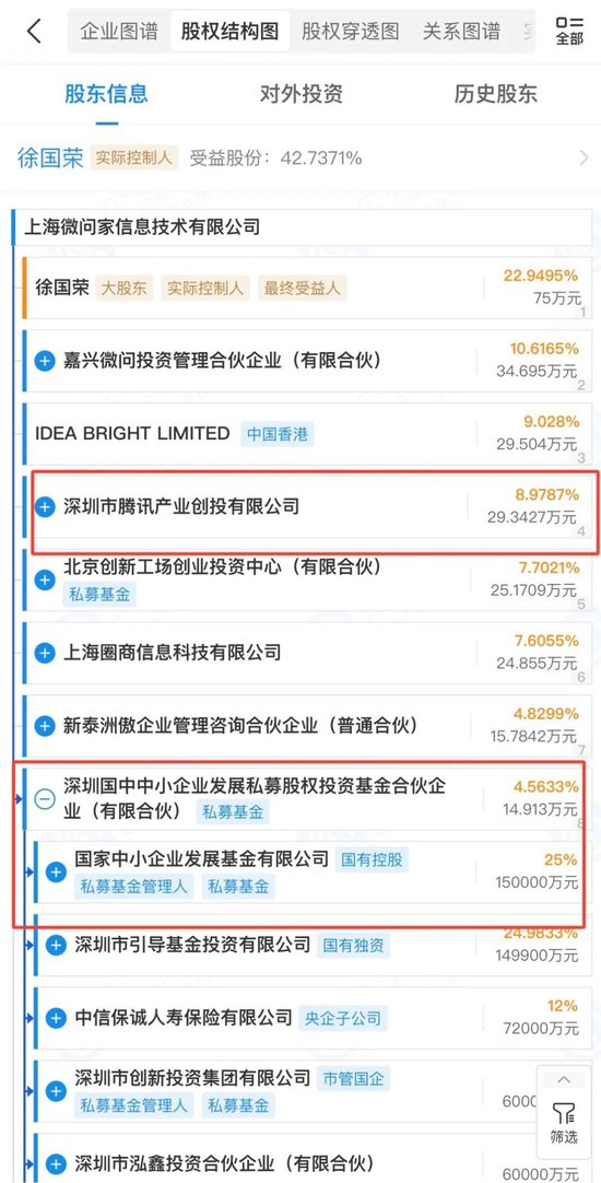 经查询,微问家股东包含深圳市腾讯产业创投有限公司(持股8.98%)及深圳国中中小企业发展私募股权投资基金合伙企业(持股4.56%)。后者被国家中小企业发展基金有限公司持股25%。