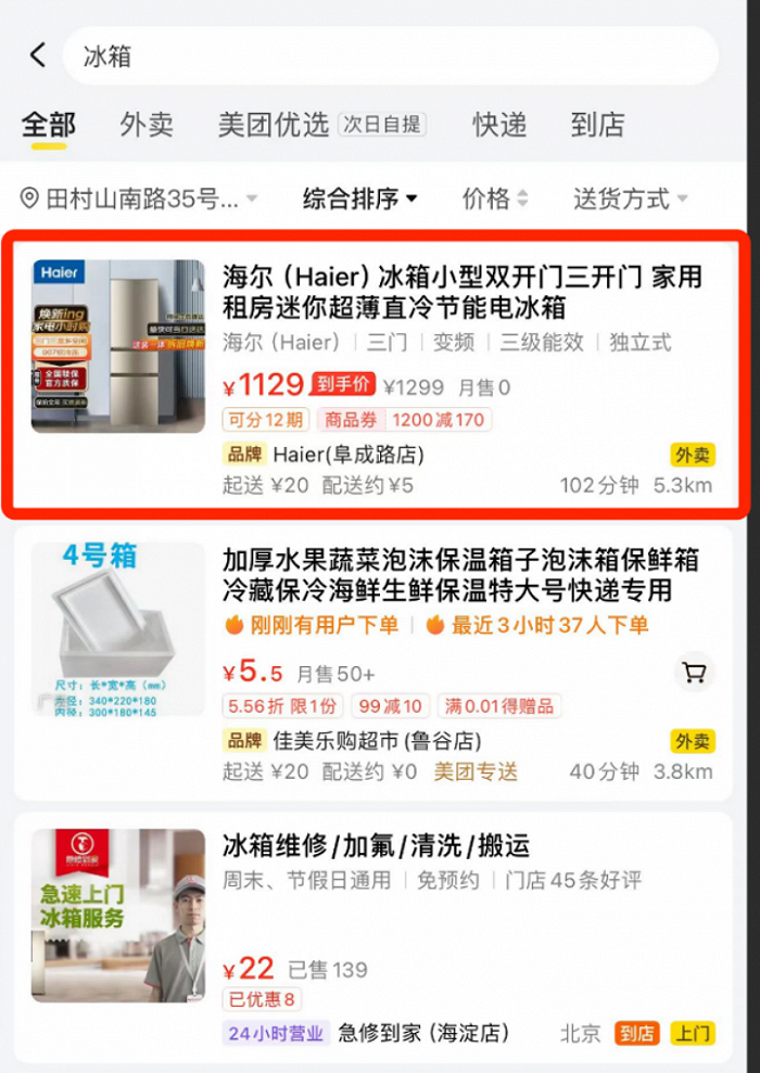 另据惊蛰研究所独家获悉,美团已于近期展开与ONLY/jackjones的合作,相关服饰品牌目前已入驻美团。同时,惊蛰研究所还注意到,当定位在国内主要一二线城市时,在美团搜空调、电视、冰箱、洗衣机等大家电,可以看到最快可以当天送达、当天安装。