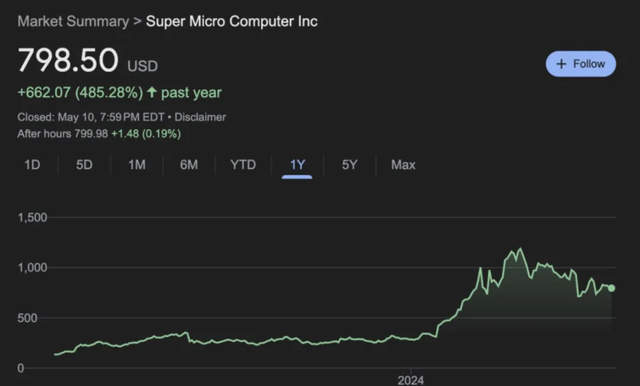 被称为英伟达“亲儿子”的超微电脑(SMCI)也是今年的黑马。从去年到2024年3月,其股价最大涨幅高达13倍,增幅超过英伟达;市值从50亿美元涨到超500亿美元。