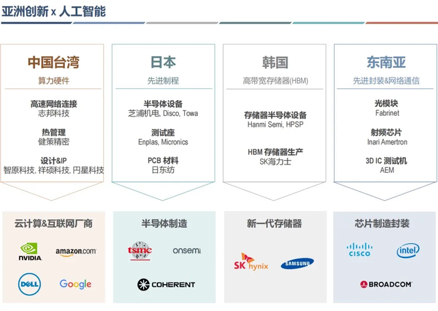 中国台湾、日本、韩国、东南亚(泰国、马来西亚等)等亚洲国家都聚集了一系列产业链上的公司,有望在AI浪潮中持续受益。