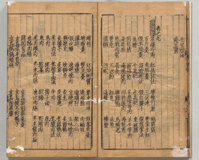《事林广记》元至顺刊本,日本内阁文库藏。此书收录大量饮食之法,教人制茶汤、酿酒、造酱醋以及烹饪各式菜肴。