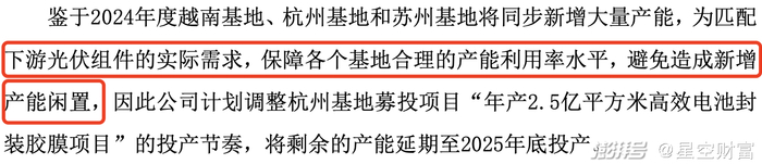 不过,即使在市场表现良好的背景下,4月11日晚间,福斯特依然宣布了拟延期年产2.5亿平方米高效电池封装胶膜项目的消息。原计划于今年6月份建成的项目,目前拟延期到2025年底建成,延期了一年半。
