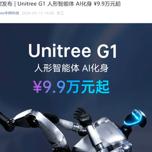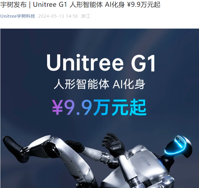 5月13日,宇树科技发布了一款名为Unitree G1(简称“G1”)的新型人形机器人,定价9.9万元起。