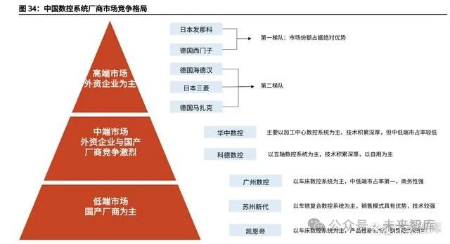 自 2017 年中国科技专项后,数控系统国产化率实现提升,打破高端市场外资垄 断局面,但目前中高端市场仍以外资为主,这主要是由于数控系统的技术壁垒与 较高的用户粘性。 目前中国数控系统市场中: 高端市场以外资企业为主,其中第一梯队代表为日本发那科、德国西门子,第二 梯队代表为德国海德汉、日本三菱、德国马扎克; 中端市场面临外资企业与国产厂商的激烈竞争,其中国产品牌华中数控主要以加 工中心数控系统为主、技术积累深厚,科德数控以五轴数控系统为主,技术积累 深厚,以自用为主; 低端市场以国产厂商为主,如广州数控(以车床数控系统为主,中低端市占率第一,商务性强)、苏州新代(以车铣复合数控系统为主,销售模式具有优势,技 术较强)、凯恩帝(以车床数控系统为主,产品性能较好,销售能力较弱)。