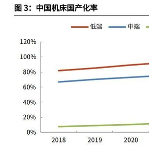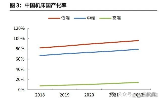 目前我国低端数控机床基本达到自给自足,中端数控机床基本实现国产替代,但 高端数控机床国产化率仍处于较低水平。根据科德数控公告,截至 2022 年底国内高端机床国产化率不足 10%。 据中国机床工具工业协会数据,2023 年金属切削机床数控化率为 45.5%。在发达国家中,日本机床数控化率维持在 80%以上,美国和德国机床数控化率均超 过 70%,与之相比国内机床数控化率提升空间较大。