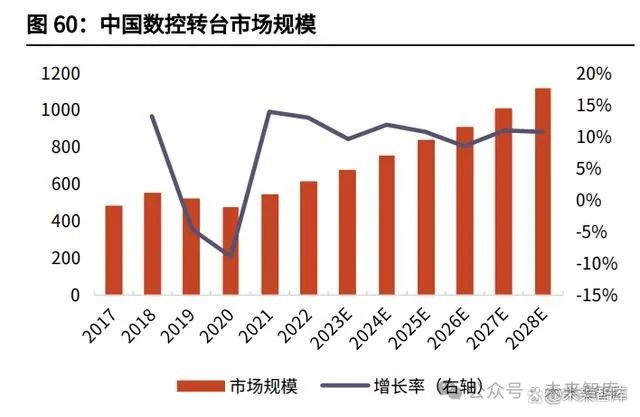 大陆及中国台湾地区生产厂家生产的中低档数控转台占据了我国大部分的转台 市场;少部分市场由美国、德国、日本等国家公司生产的高端产品所占据。内地 最具竞争力的数控转台生产厂家是烟台环球机床附件集团有限公司,该厂家的产 品体系完备,规格齐全,种类繁多,且设计开发和制造方面具备丰富的经验。中 国台湾地区的德川机械股份有限公司是专业数控转台生产厂商之一。国外有日本 的 NIKKEN(日研)、德国 Peiseler、美国 HASS 公司等专业的生产厂家。国内 生产的数控转台产品与国外的产品相比,在精度、速度及可靠性等参数上仍与国 外数控转台存在一定差距。 2021 年中国数控转台市场销售收入达到了 5.43 亿美元,据 QYResearch 预计, 2028 年可以达到 11.17 亿美元。 从产品类型及技术方面来看,单轴占有重要地位,2021 年份额达到 89.43%, 销量达到 58678 台,而双轴由于价格较贵,从 2021 年销量上来看仅为单轴的 1/9,达到 6935 台,但销售额超过单轴的 1/3,达到 1.44 亿美元。预计未来单 轴和双轴的比例稳定,在 2028 年,单轴的销量将达到 104280 台,而双轴达到 13671 台。 从产品市场应用情况来看,与立式数控机床配套使用的数控转台最多,接近 60%,在 2021 年达到 38816 台,而卧式和龙门分别达到 19330 台与 7467 台。 未来增长速度最快的为龙门数控机床,2022-2028 年的 CAGR 达到 9.69%。目 前中国主要厂商包括旭阳国际精机、宝嘉诚、德川机械、潭佳精密科技和潭兴精 工等,2021 年 Top5 厂商份额占比超过 50%。