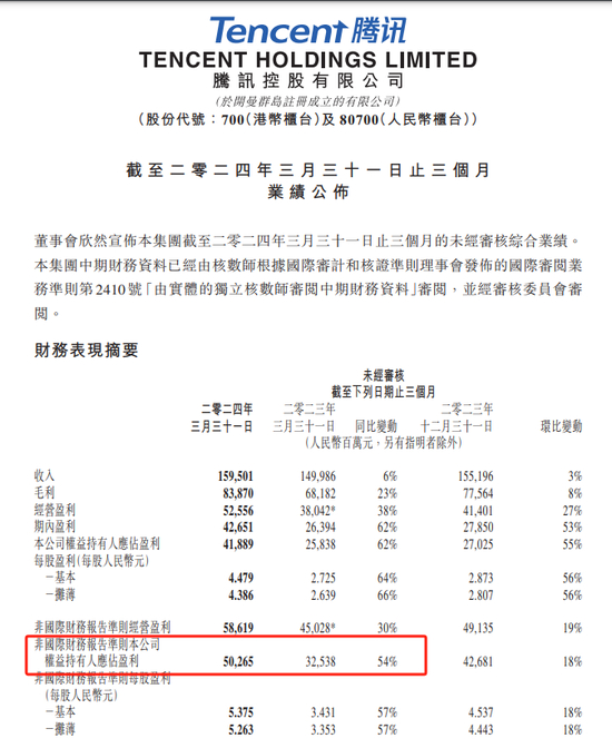 腾讯控股今日公布一季报,公司今年一季度总收入为1595.01亿元,同比增长6%,毛利838.7亿元,同比增长23%,净利润502.65亿元,同比增长54%。