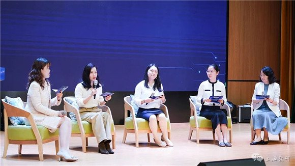 盛肇靖、蒋维婷两位教研员与上海嘉定区世外学校徐笑颖、中科院上海实验学校徐悦、同济大学附属实验中学王影三位教师一起,以“以智助教,以智助学,以智助研——数智技术赋能学习方式转变的区域实践”为题,围绕研究背景、区域实践和总结展望三个方面进行专题发言。