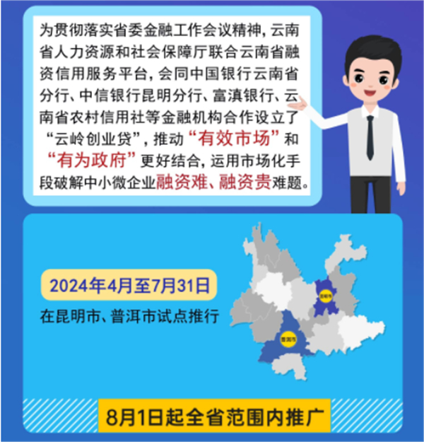 为贯彻落实党中央关于“更加突出就业优先导向”的决策部署和省委、省政府“着力稳就业促创业”工作要求,云南省人力资源和社会保障厅针对创业主体普遍面临的融资难、融资贵问题,组织调研问需、对接洽谈、会商政策,并联合云南省融资信用服务平台,会同中国银行股份有限公司云南省分行、中信银行股份有限公司昆明分行、富滇银行股份有限公司、云南省农村信用社等金融机构创新设立“云岭创业贷”专项贷款,着力促进创业主体健康可持续发展,发挥创业促发展、促就业、促增收效应。