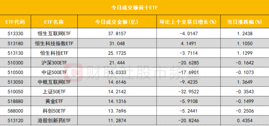 从成交额前十的ETF来看,前三位均为恒生指数相关ETF,其中恒生互联网ETF(513330)成交额继续位居首位;前十的ETF成交额环比昨日均减少。