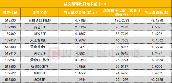 从成交额环比增长前十的ETF来看,港股通红利ETF(513530)成交额环比增长190%位居首位;有色ETF(159980)成交额环比增长近一倍位居次席。