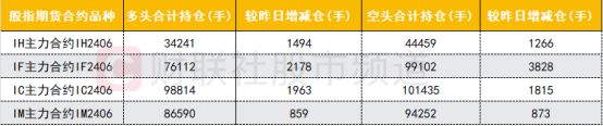 四大期指主力合约多空双方均加仓,其中IH、IC合约多头加仓数量较多;IM合约空头加仓数量略多;IF合约空头加仓数量明显大于多头。