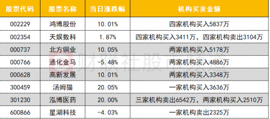龙虎榜机构活跃度一般,买入方面,多只AI概念股获机构买入,其中鸿博股份获机构买入超5000万,高新发展、汤姆猫均获机构买入超3000万;北方铜业获机构买入超5000万。