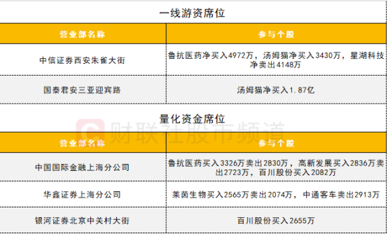 一线游资活跃度一般,合成生物概念股鲁抗医药获中信证券西安朱雀大街营业部买入近5000万,该席位昨日也买入该股超5000万;汤姆猫获两家一线游资席位买入,其中国泰君安三亚迎宾路营业部买入1.87亿。