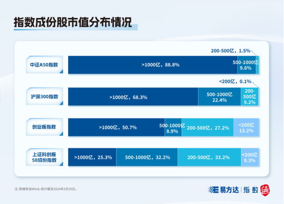 若将这四只宽基指数按照平均市值从大到小排序,依次为中证A50指数、沪深300指数、创业板指数、上证科创板50成份指数。