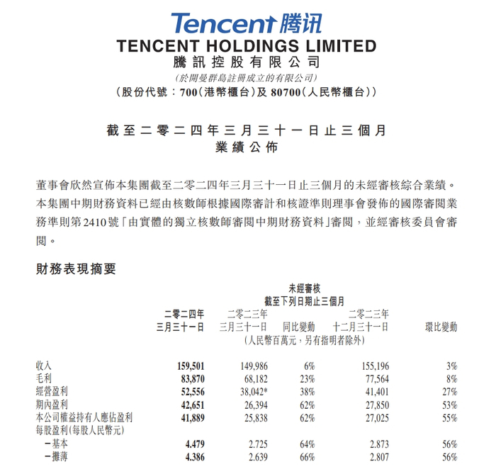 两款本土市场旗舰游戏《王者荣耀》及《和平精英》开始受益于新的商业化节奏和游戏内容设计的提升,在二零二四年三月的流水实现同比增长。