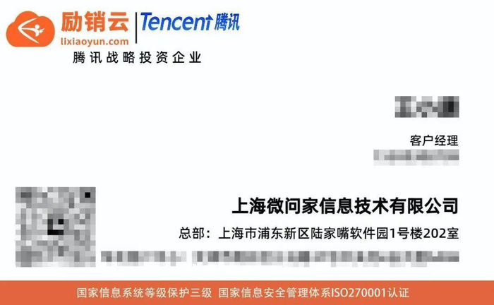 每经记者注意到,该销售人员名片上使用了腾讯标识,微信名称也特别标注“腾讯励销云~某某”,但其出示的销售合同模板上并未出现腾讯字样。