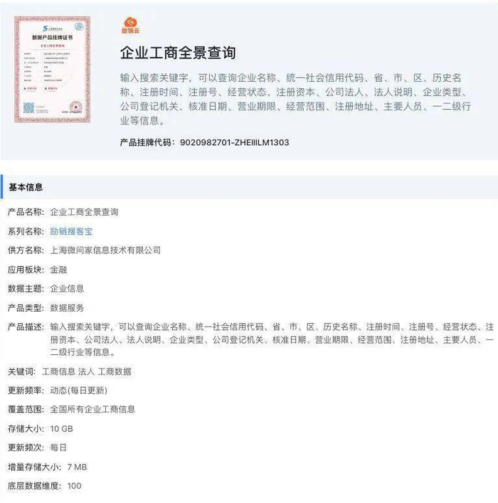 记者查阅“企业工商全景查询”挂牌证书发现,该证书对应的产品描述中并未包含“提供法定代表人联系方式”的许可,该公司在上海数交所的其他挂牌证书也未包含该许可。