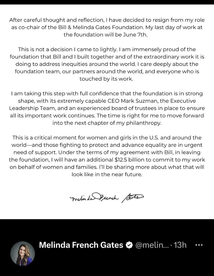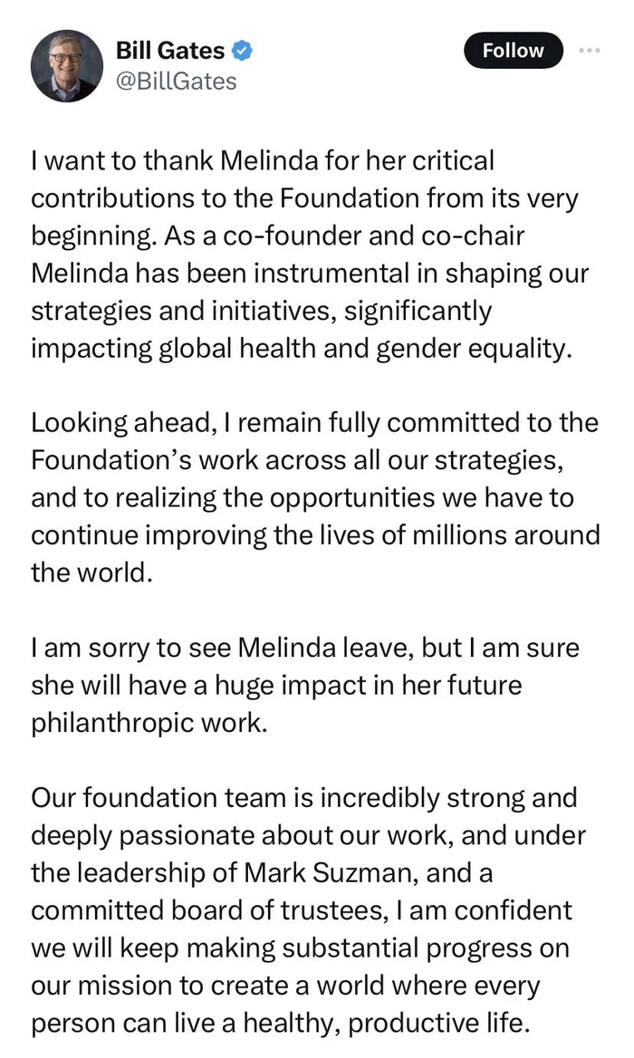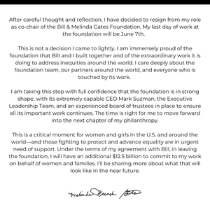 在社交媒体上发布的另一份声明中,比尔·盖茨感谢了梅琳达·盖茨为基金会所做的工作,他说:“梅琳达在制定我们的战略和倡议方面发挥了重要作用,对全球健康和性别平等产生了重大影响。”他还重申,他仍然“完全致力于基金会所有战略的工作”。