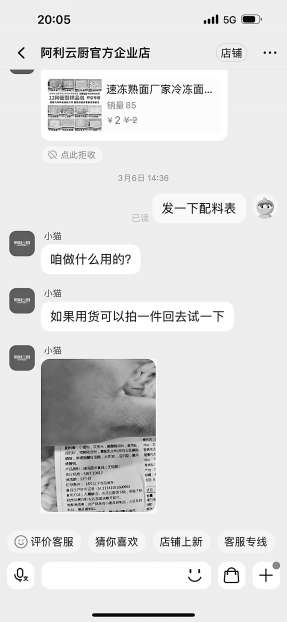 记者在采访中发现,不明示食品配料表的现象在各大购物平台很常见。当消费者主动索要时,客服或痛快提供、或拖拖拉拉,比如冷冻面企业阿利云厨官方企业店,客服提供配料表时先推脱明天到公司拍,第二天又问要配料表做什么,最终提供的配料表则用手遮住了企业名称,配料表显示包含七八种添加剂。记者在其他经销商客服提供的配料表中发现,另一款速冻面条添加剂多达12种。