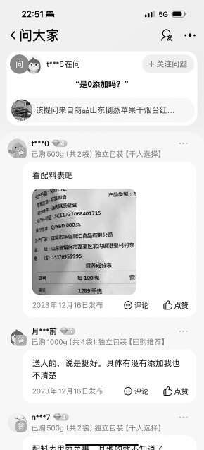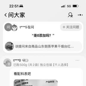 记者在调查中发现,消费者要想得到配料表,除了主动向客服索要外,只能碰运气在提问或者买家秀里找,有时候会有买家拍照分享。