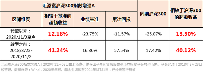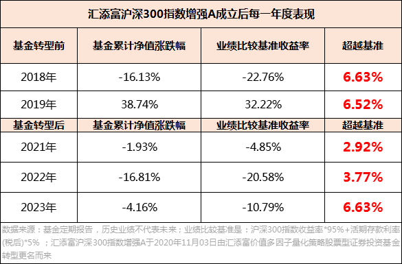 事实上,汇添富沪深300指数增强以前不叫这名字,它是由汇添富价值多因素量化策略股票基金于2020年11月3日转型更名而来。