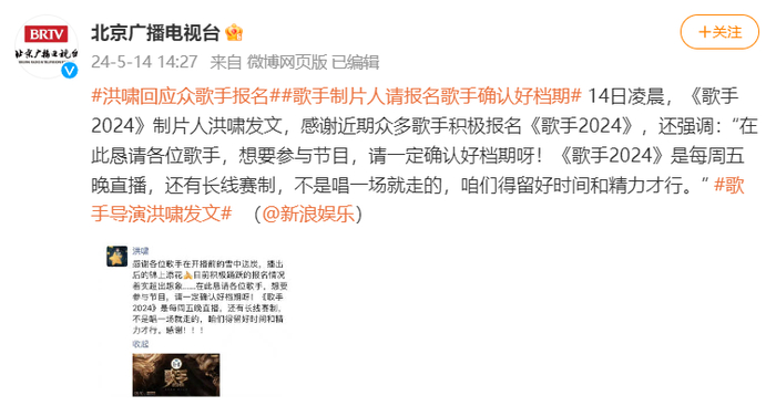 随后,多位实力唱将“请战”。14日凌晨,《歌手2024》制片人洪啸发文,感谢近期众多歌手积极报名《歌手2024》,还强调:“在此恳请各位歌手,想要参与节目,请一定确认好档期呀!《歌手2024》是每周五晚直播,还有长线赛制,不是唱一场就走的,咱们得留好时间和精力才行。”