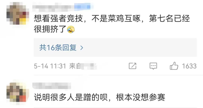 有网友评论称,“说明很多人是蹭的呗,根本没想参赛。”还有人喊话称,“想看强者竞技,不是菜鸡互啄。”