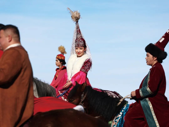 2024年2月23日,阿勒泰地区吉木乃县。第五届萨吾尔冬牧文化旅游节上盛装打扮的哈萨克族姑娘。(图/视觉中国)